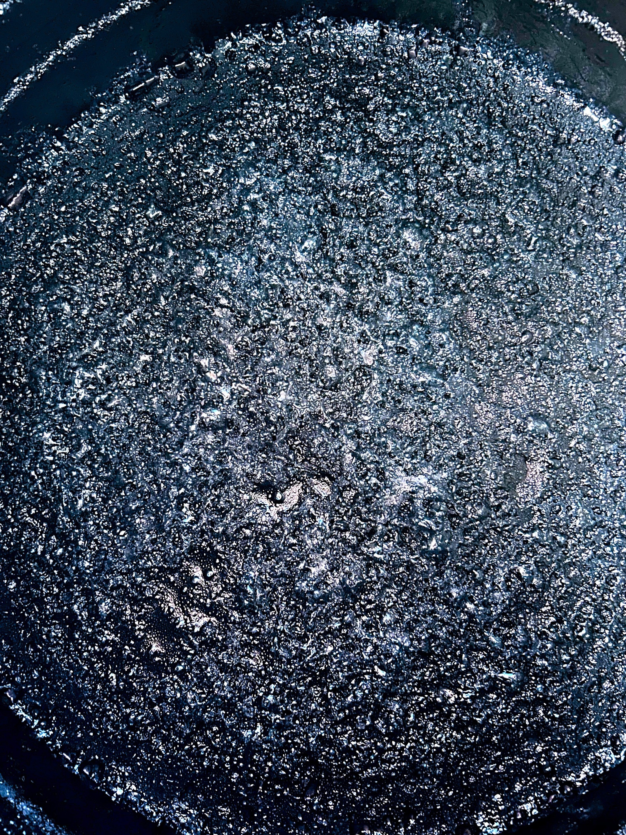 『藍染め』と言っても様々な手法があり、今回教わるのは藍を天然発酵させた本格的な藍染めです。昔ながらの灰汁発酵建ては、染料のすくもに灰を溶いた灰汁を加え時間をかけて発酵させるという技法です。表面にプツプツとしたものが『藍の華』。発酵が始まると咲き始める嬉しい瞬間です。