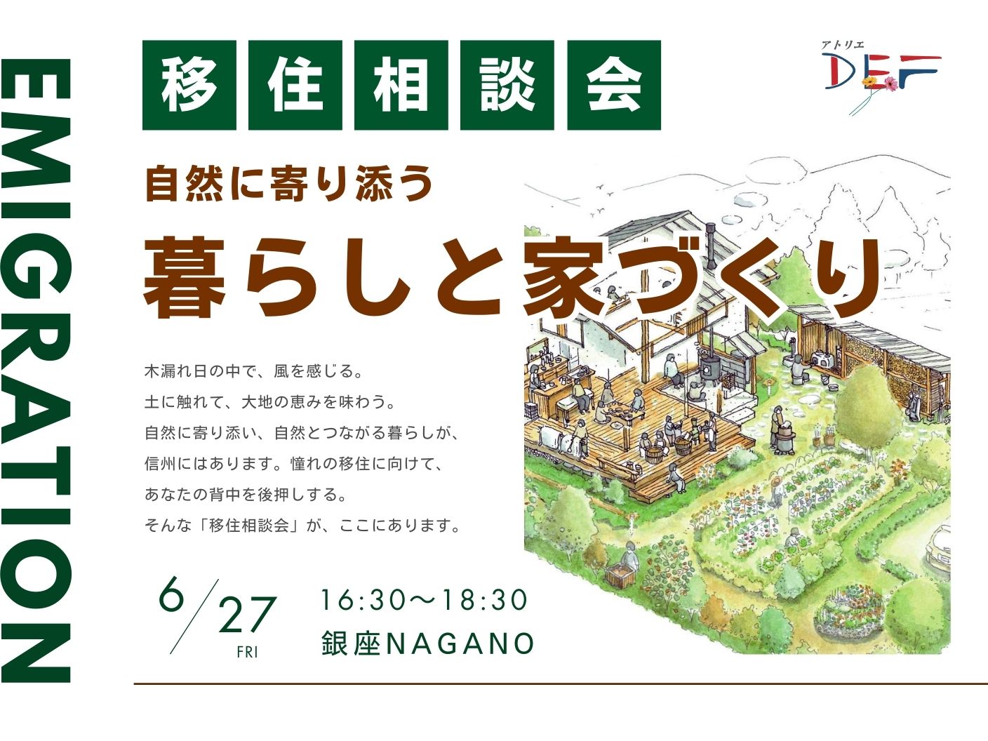 本イベントでは、長野県全域での施工実績を多く持つアトリエデフとして、各エリアの気候風土や利便性、暮らしの情報はもちろんのこと、家づくりにおいて、住まう家族が「より安全に、安心して暮らす」ための素材の選択、自然と繋がる「循環するエネルギー」の選択についてもご紹介する予定です。