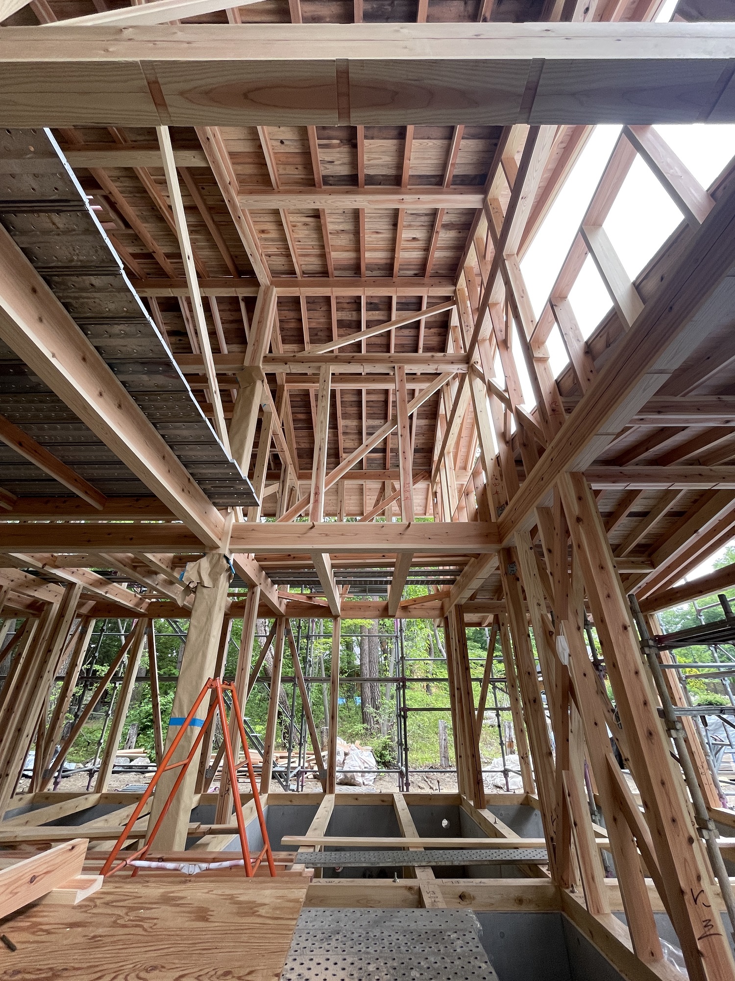 そうそう、構造を成す柱・梁・桁等の杉材は、大黒柱伐採ツアーでお馴染み「KURIMOKU」さんから届けられた立派な国産材です。木の繊維組織を破壊することなく、ゆっくりと「中低温乾燥」した材木で、そこに防虫・防腐効果も持たせた「燻煙乾燥」も組み合わせています。構造見学会では、力強い構造美と併せて、燻煙の爽やかな香りもお楽しみいただけるかもしれませんね。