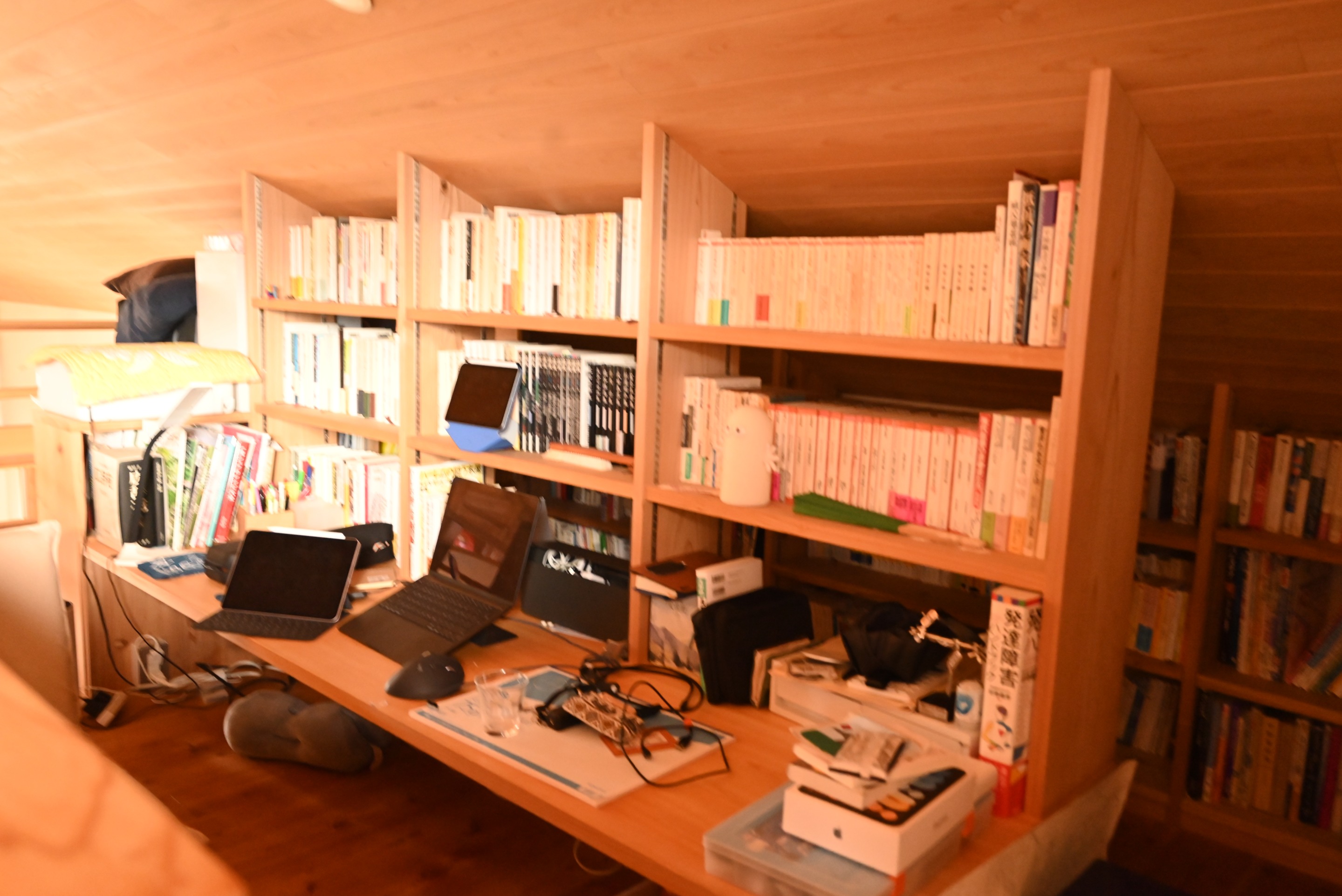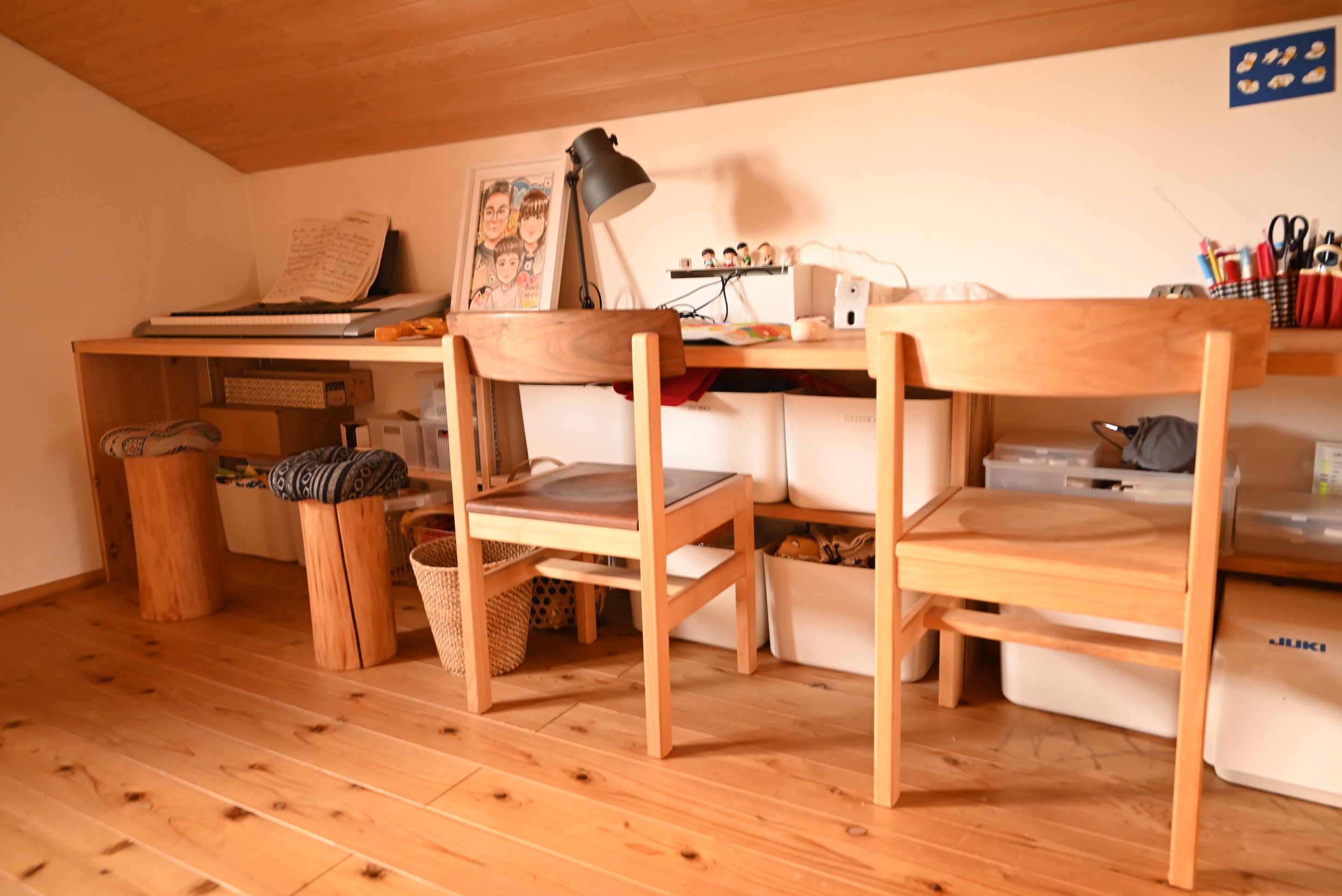 2階の特徴としては、仕切られた部屋にはしていないものの、家族一人ひとりが集中できる場所も作っているところ。例えば写真の左奥は・・・。